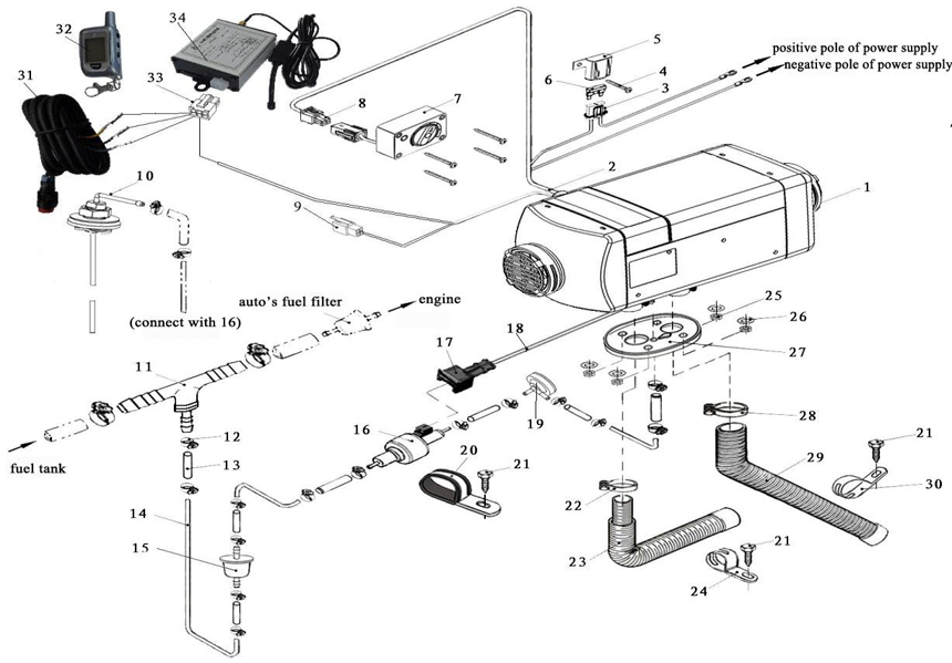 - سخانة مياه للشاحنة بقدرة 5 كيلو وات في داخل سخان الماء يتم خلط وتشعيل هواء الحرق من البيئة والوقود من خزان المركبة في داخل غرفة الحرق.